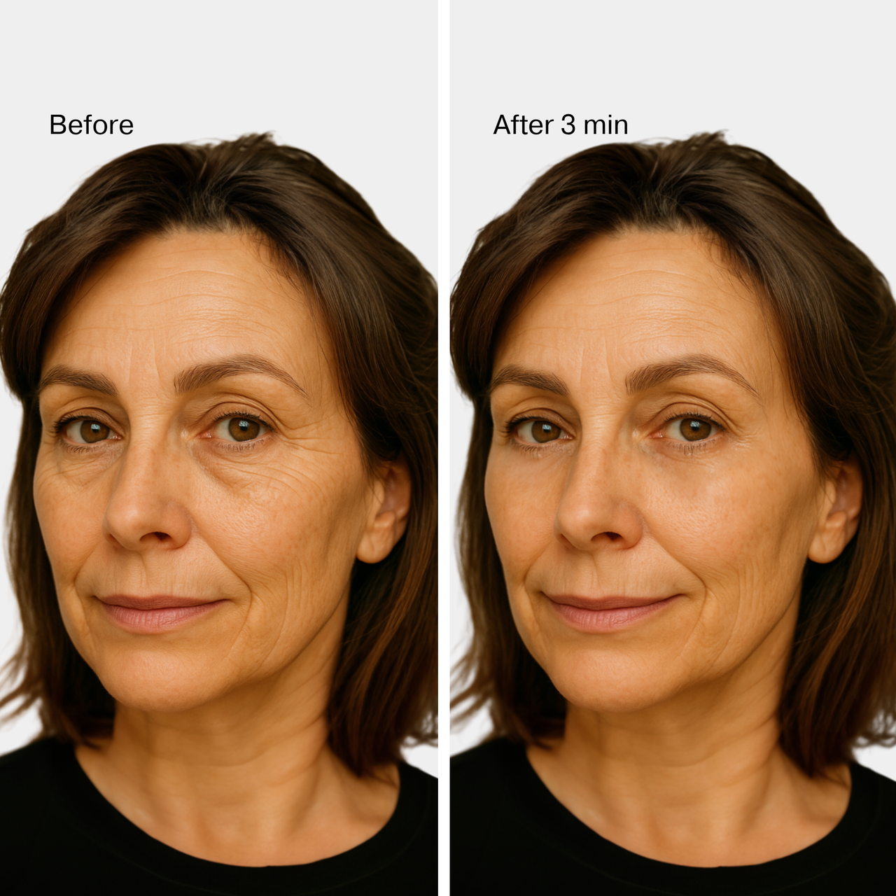 Onze Crème vermindert rimpels en wallen in slechts 3 minuten en vanaf de eerste applicatie. Het resultaat blijft 8 tot 12 uur lang zichtbaar. Deze nieuwe formule is zacht en delicaat voor de huid. Het kan gemakkelijk gecombineerd worden met make-up zonder trekkerig, vervelend gevoel.